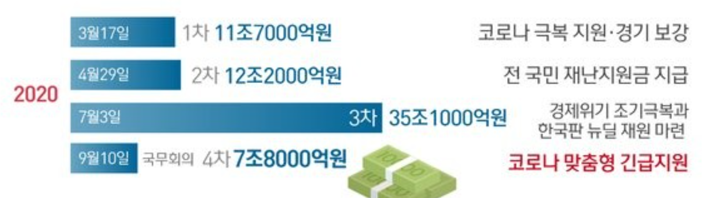 4차 예산을 편성한 후 피해입은 업종의 지원에 대한 예산을 미리 집행하고 지원금은 방역의 상황에 따라서 집행시기 정하는 방안검토중이며 거론되는 소요예산규모는 최소 20조~ 30조원 수준이라고 합니다.